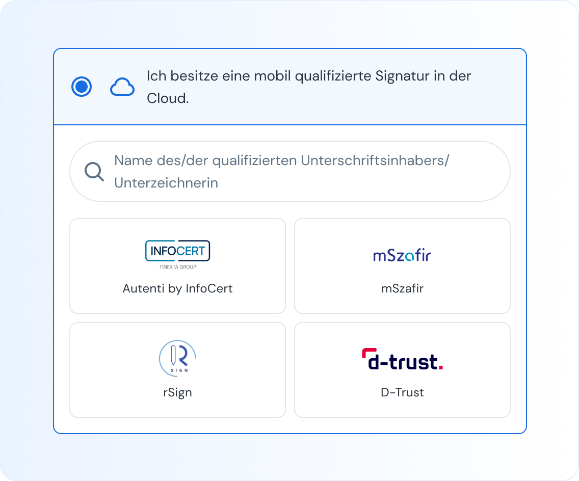 Hast du bereits eine qualifizierte Signatur? Wir bieten eine dedizierte Integration mit mehr als 23 Anbietern von QES. Wie zum Beispiel InfoCert, D-Trust, Evrotrust oder Asseco SimplySign.