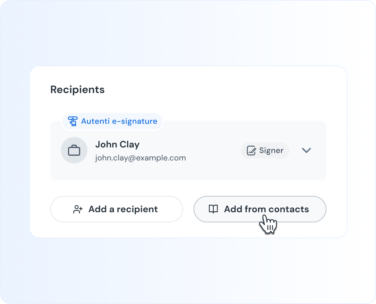 Never hunt for an email address or guess a role again. Save contacts to your address book, pre-set their default signature type and role (like "Signer" or "Reviewer"), and add them to documents in one click.