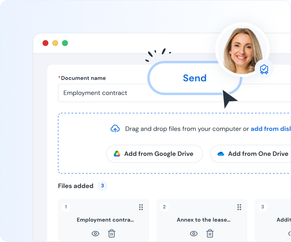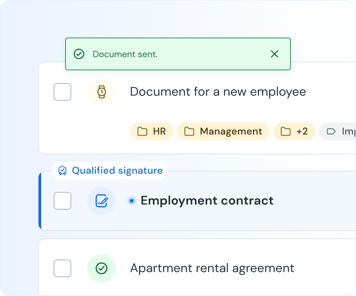 Add multiple documents, define roles and signature types, set the signing order – and every file reaches the right people without mistakes.