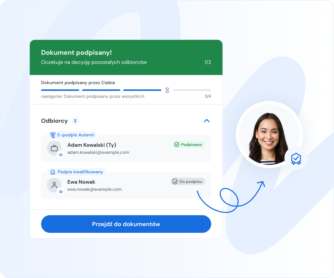 Ułatw swoim kontrahentom współpracę z Tobą. Autenti zostało zaprojektowane tak, aby było całkowicie intuicyjne dla podpisujących, dzięki czemu Twoje dokumenty wracają do Ciebie szybciej, a samo podpisywanie staje się pozytywnym doświadczeniem.